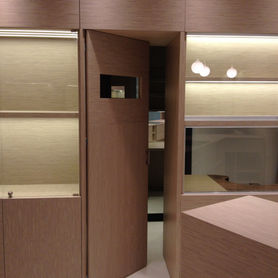 Le bois continu même dans les vitrines en devenant un fond "brut" naturel tout en mettant en valeur les bijoux rangés sur les plateaux habillés en alcantara.